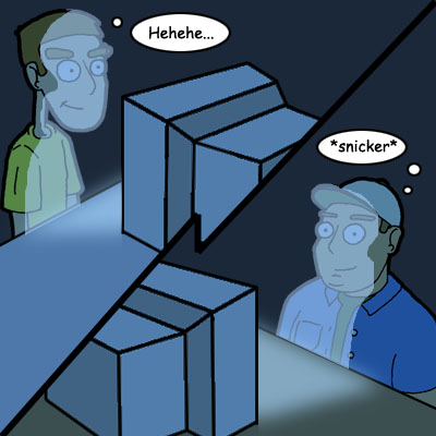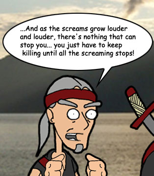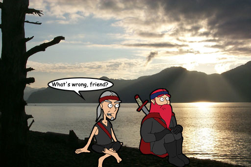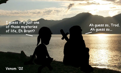 Personally this is one of my favorites. I had drawn some extra artwork to tack onto Branton and Trodais in order to get their full bodies sitting down on the ground their. Changing their sizes, and zooming in on some frames added a bit of extra emotion too. This is the first comic where I incorporated eyebrows that were in a different position that normal for Branton. You'd think I would have done that earlier. Ah well, like I've said earlier, this is my first venture into this area of work. That and my ever present excuse for anything thats ever wrong: "This just started out as a gag! I can only improve!". Ain't it the truth though? |