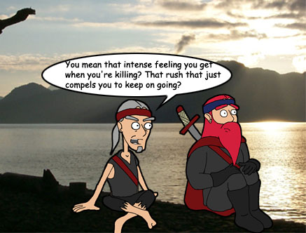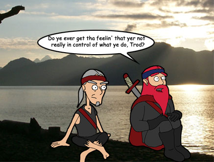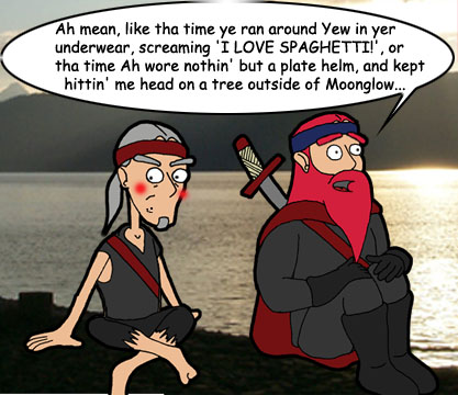 I think anyone who RPs a serious character knows where I'm going with this comic. Sometimes, during off time, talking OOC with friends, we can get goofy, hehe. I mean, hey, all work and no play makes Branton a dull drunk. So I figured, well, if our characters were really alive, and our In Character thoughts were really their independant thoughts, how would they react to our actions when we make total fools of our characters?