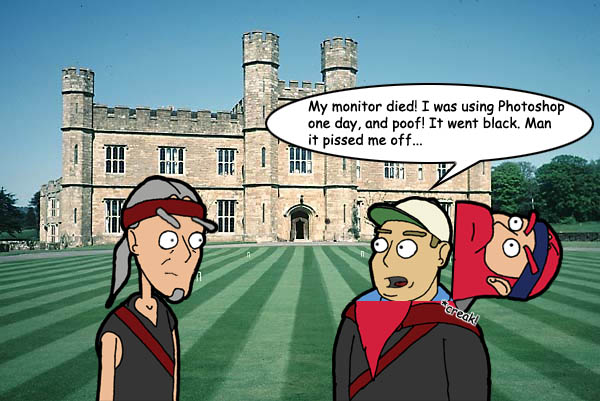 | Just when you thought it was safe to go OOC... it wasn't! This happens a few times (not to me, necessarily, but I like to show that I can joke about myself as well as others) while RPing in a guild event. Other players wander off screen, and you start talking to a friend about something thats going on. Then the big bad Guild Master comes back and yells at you, hehe. As for the content of the comic, it had been over a week since I did a comic, and that's because my monitor really did die. But I'm back in full force with a brand new awesome monitor. It's like a whole different world now! |