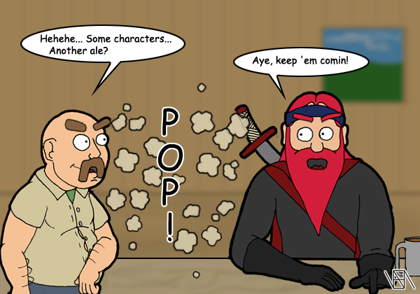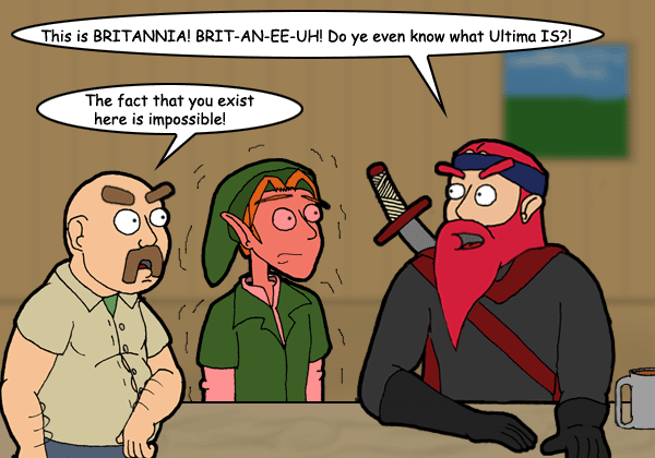 Okay, okay, okay. Let me say this outright... the views presented in my comics are NOT necessarily the views held by my fellow guildmates! This is a comic that ties in with my Ultima views... I said this before (though not on this site) and I'll say it again. I'm an Ultima nut. I love all of the old Ultima games (save Ultima IX, which was a cool game in it's own right, but not an Ultima in my view. More on that later, possibly). The Ultimas were some of my first computergames, and Ultima 7 stands out as my favorite game, console or PC, of all time. I won't get into reasons now, lets just say it rocks :) Anyhow, when UO came out, at first I was stoked. Here I was, able to interact with other Ultima fans, in a living breathing Britannia! Granted, I couldn't be the Avatar, journeying with Iolo, Dupre, Shamino and the gang as I had in all my other ventures, but I could still be a living partcicipant! But then I played it...